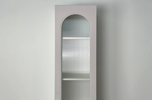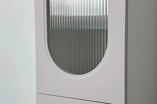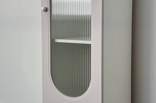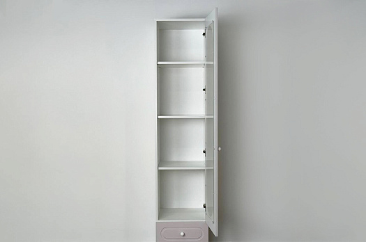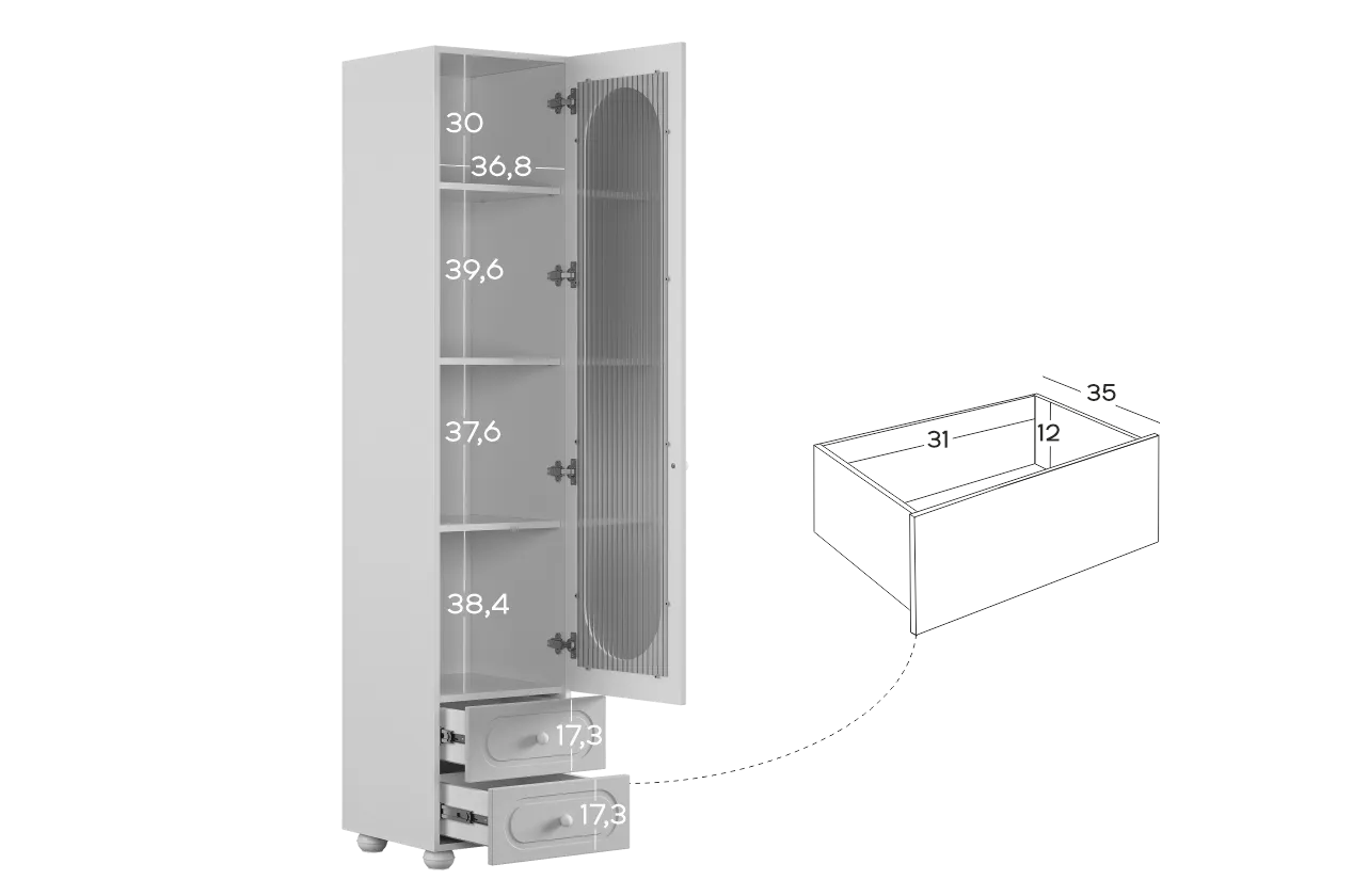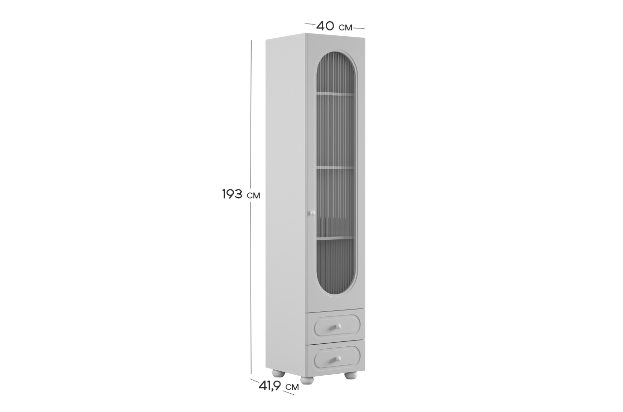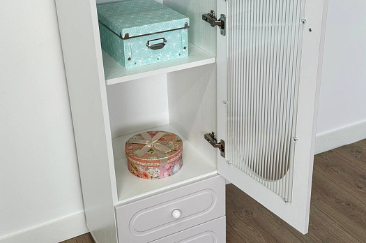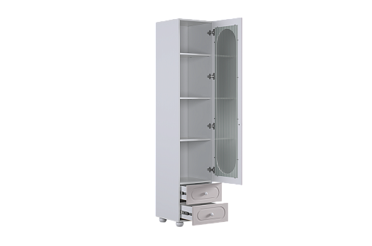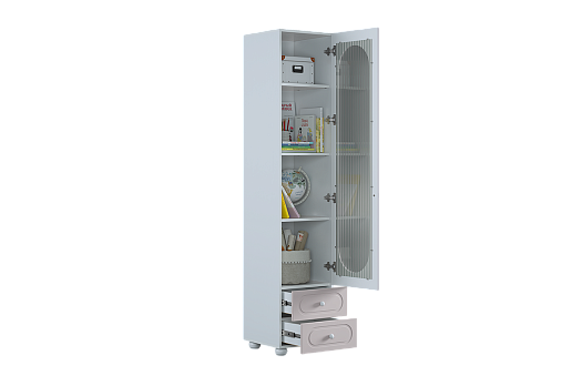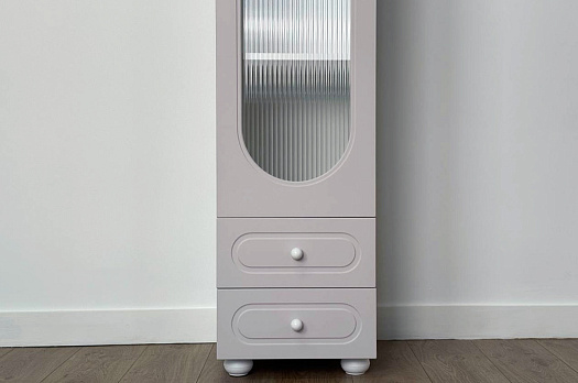 Модель оснащена одной распашной дверцей с вставкой из прозрачного рифлёного стекла, а также двумя вместительными выкатными ящиками в нижней части для хранения одежды, текстиля или аксессуаров. Внутреннее наполнение можно выбрать в зависимости от задач: шкаф комплектуется полками или штангой для плечиков, что позволяет адаптировать его под разные потребности.