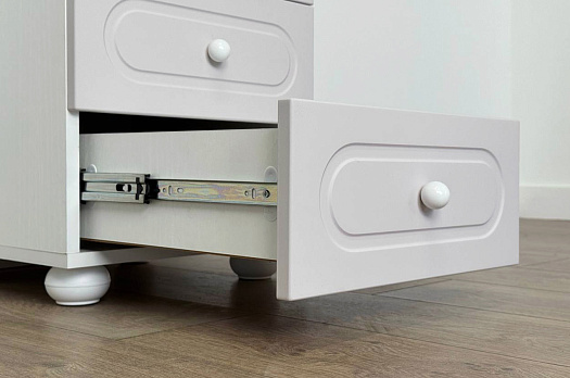 Корпус выполнен из ЛДСП толщиной 16 мм, фасад изготовлен из МДФ в плёнке ПВХ и декорирован фрезеровкой, характерной для серии Милана. Оригинальные круглые ручки и опоры завершают образ, подчёркивая аккуратный и современный дизайн мебели.