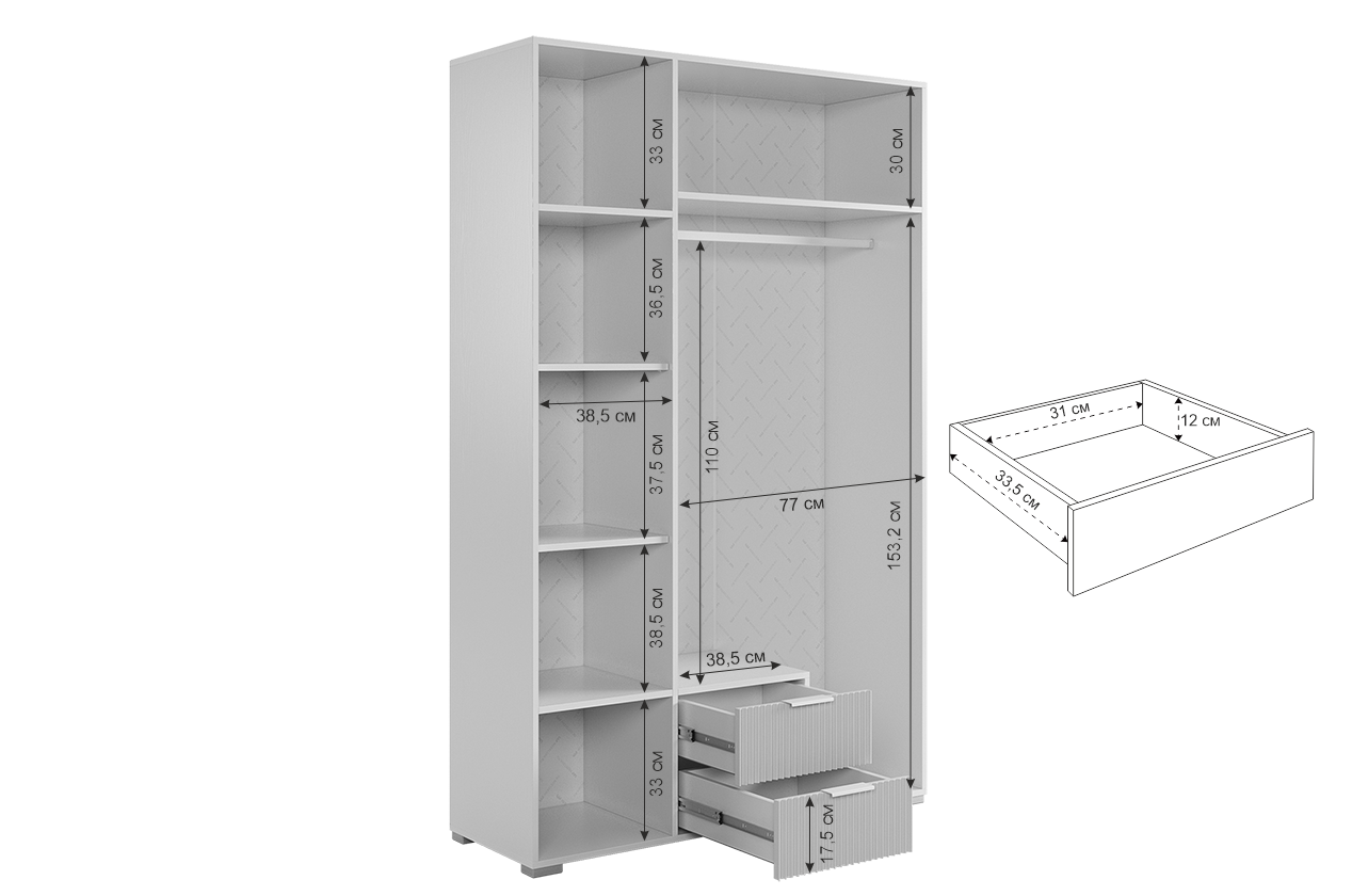 Но не только его внешний вид впечатляет. Шкаф "Зефир" обладает практичным и удобным внутренним наполнением. Среднее отделение оснащено двумя ящиками с шариковыми направляющими, что позволяет легко и плавно открывать и закрывать их. А зеркальное покрытие на средней двери добавляет функциональности и помогает при выборе образа.