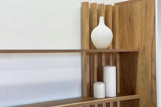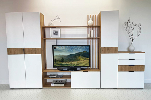 Состоит из: тумбы с открытыми и закрытыми секциями и полками над ТВ зоной.