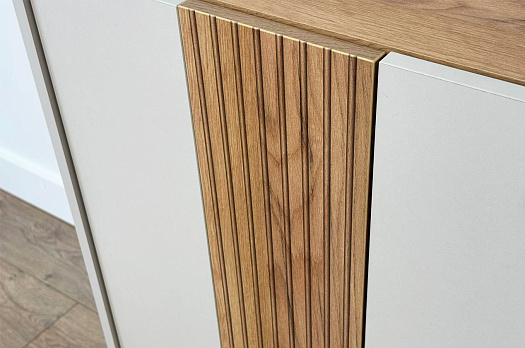 Одна сторона комода оснащена глухим фасадом с декоративным элементом в цвете "дуб крафт золотой". Этот декоративный элемент придает комоду уникальный и элегантный вид, добавляя теплоту и уют в вашу комнату.