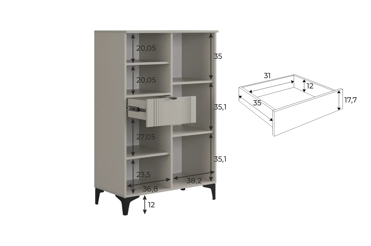 Дизайн комода продуман до мелочей: с одной стороны расположена глухая дверца, за которой скрывается просторное пространство для хранения. С другой стороны – ниша с открытой полкой, выкатной ящик и ещё одна глухая дверца, что позволяет гибко организовать хранение и поддерживать порядок в доме.