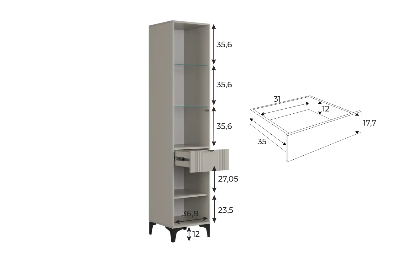 Шкаф оснащён надёжной металлической ручкой и имеет удобное внутреннее наполнение: надёжные полки за стеклянной и глухой дверцами, а также выкатной ящик. Это позволяет рационально использовать пространство.