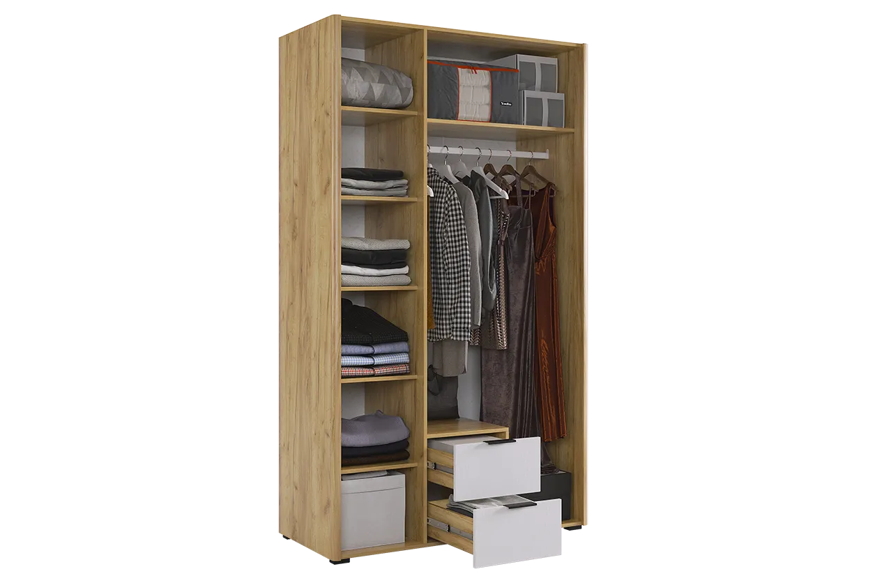 Вместительный шкаф имеет полки, ящики выдвижные и штангу для одежды, а полукруглые, обтекаемые углы обеспечат безопасность и комфорт.