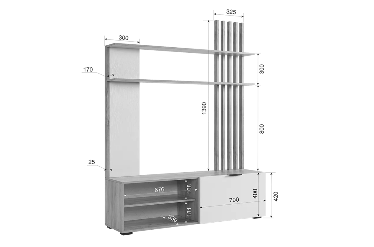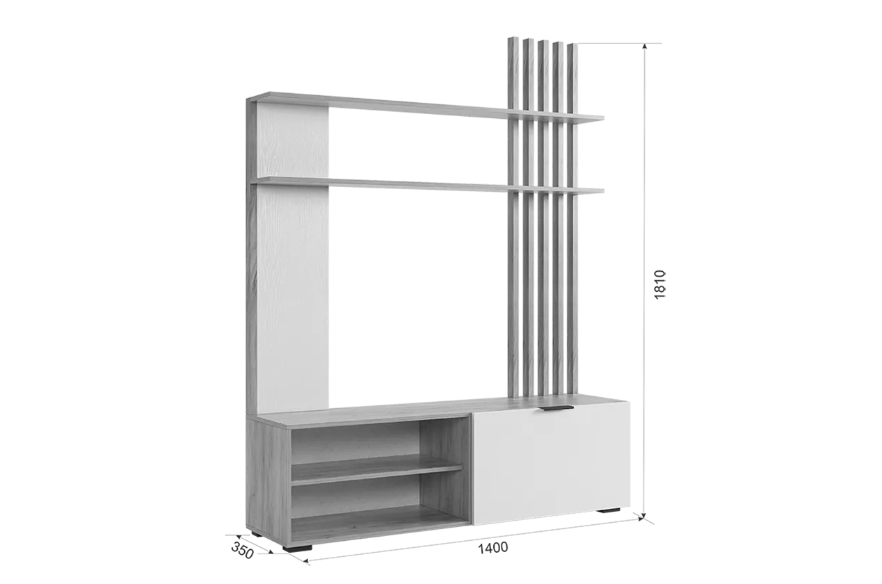 Состоит из: тумбы с открытыми и закрытыми секциями и полками над ТВ зоной.