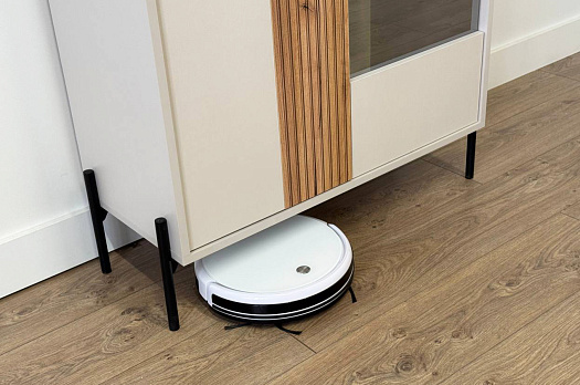 Другая сторона комода оснащена выкатным ящиком и фасадом со стеклом, обладающим зеркальным эффектом. Это не только добавляет современности и шарма, но и обеспечивает дополнительное пространство для хранения декоративных предметов и книг.