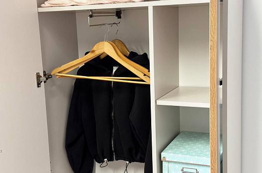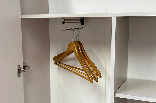 Шкаф "Доминика" оснащен глухими фасадами, скрывающими за собой просторное внутреннее пространство. На одной стороне шкафа находится штанга для одежды, обеспечивая удобное место для хранения одежды на вешалках.