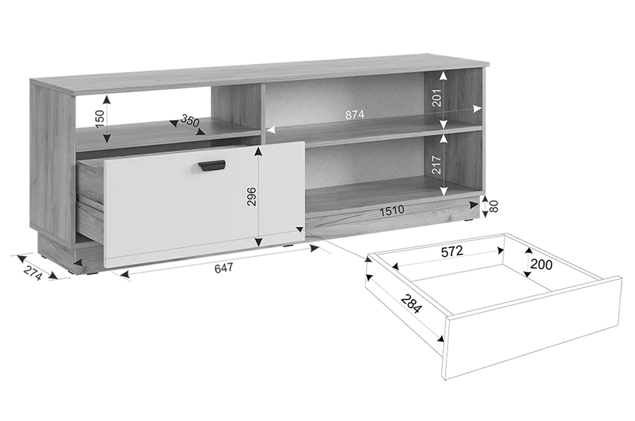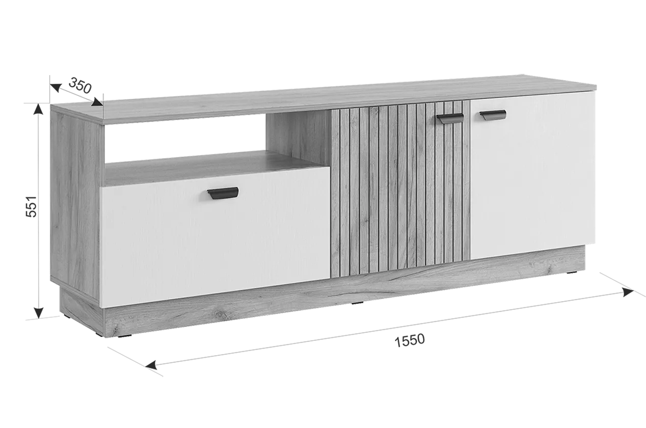 Тумба "Моди"- это вместительный выдвижной ящик, большой отсек с полкой и открытая ниша для мелочей, лучшее решение для гостиной и других комнат.