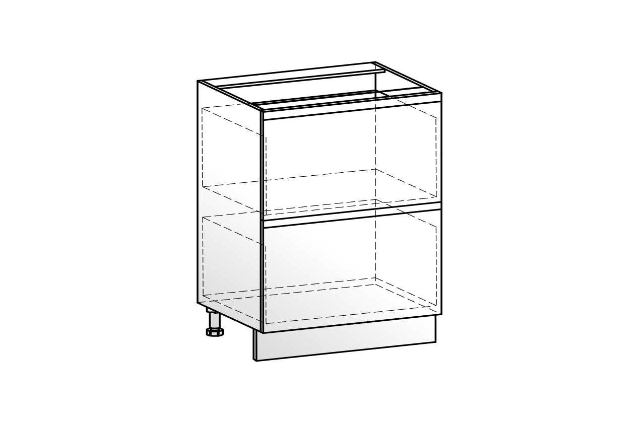 Состоит из: рабочего шкафа с двумя выкатными ящиками на системе СТАРТ (плавное и бесшумное открывание и закрывание, встроенные доводчики).