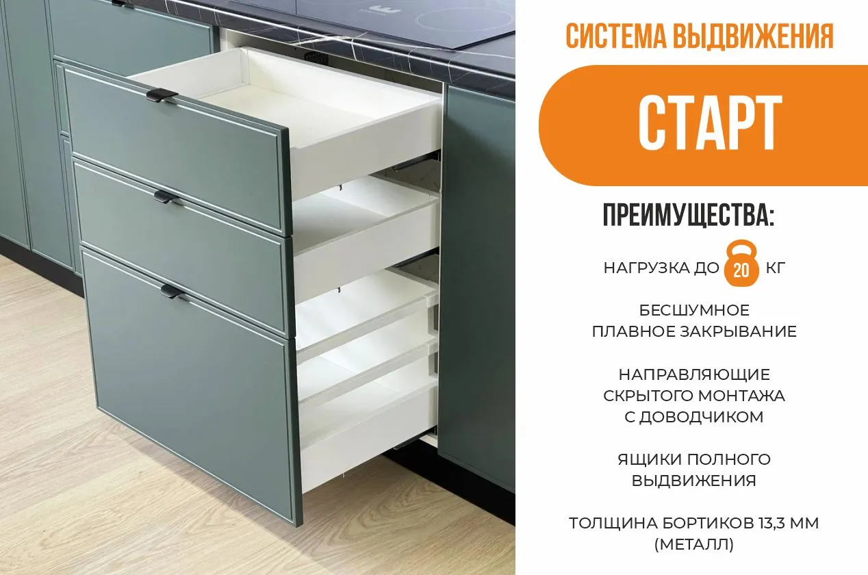 Состоит из: рабочего шкафа с двумя выкатными ящиками на системе СТАРТ (плавное и бесшумное открывание и закрывание, встроенные доводчики).