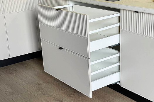3) И другие позиции: мойка, сушка для посуды, плинтус для столешницы, цельный цоколь, стыковочные и соединительные планки, доводчики для дверей и ящиков, стол обеденный, стулья.