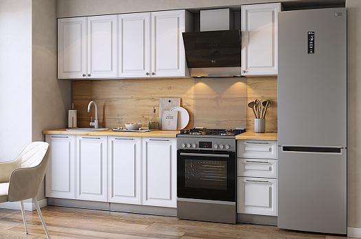 Заказывала этот гарнитур для небольшой кухни, ширина 2 метра подошла идеально. Очень довольна покупкой! Белый цвет с эмалью смотрится свежо и визуально расширяет пространство. Качество сборки хорошее, все детали подошли точно, фурнитура работает плавно. Особенно понравились ручки в античном серебре - добавляют изящности. Шкафы вместительные, три выдвижных ящика в нижнем модуле очень удобны для хранения. Доставка была аккуратной, упаковано надежно. За такую цену отличное соотношение качества и внешнего вида. Рекомендую!