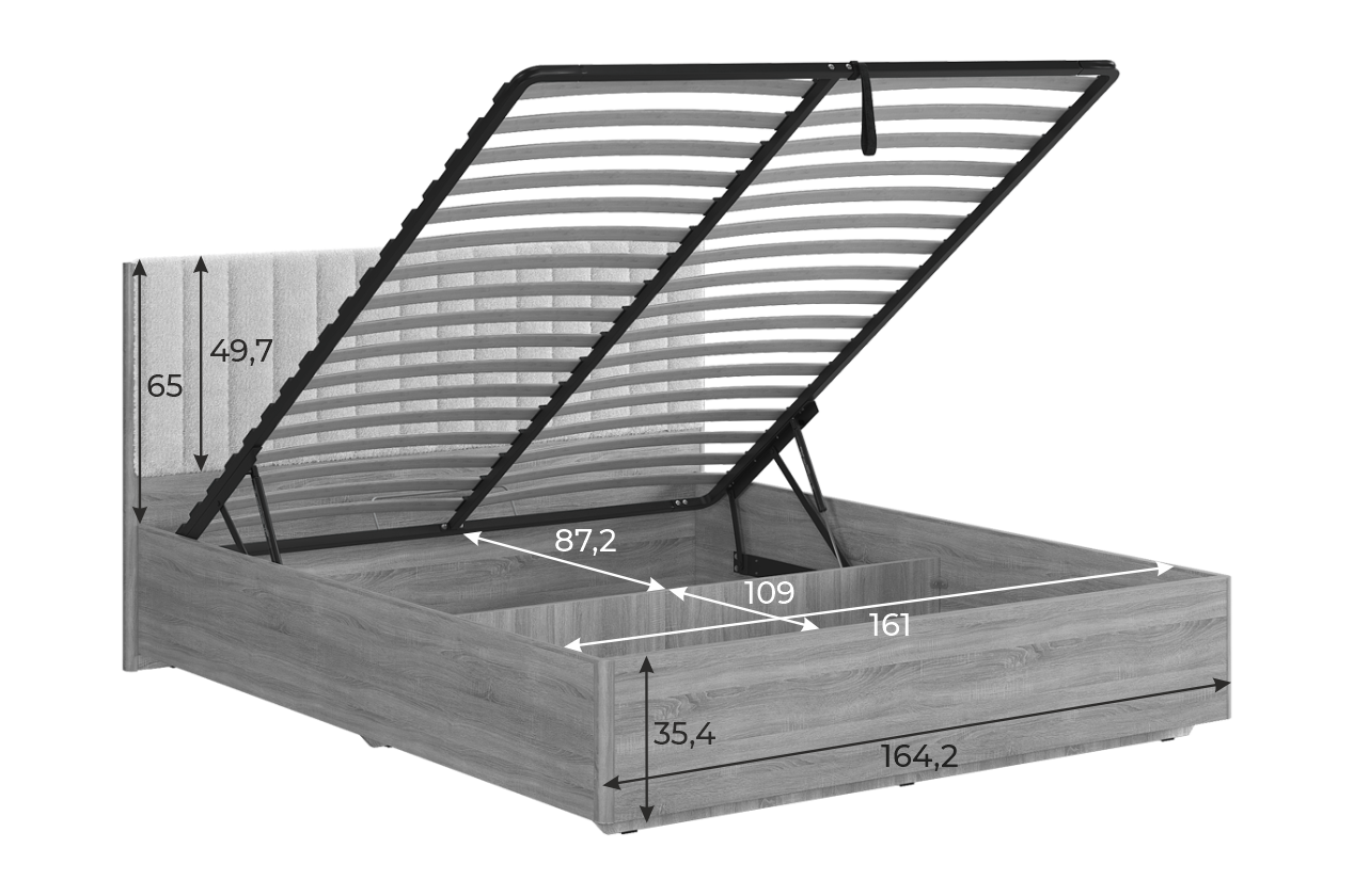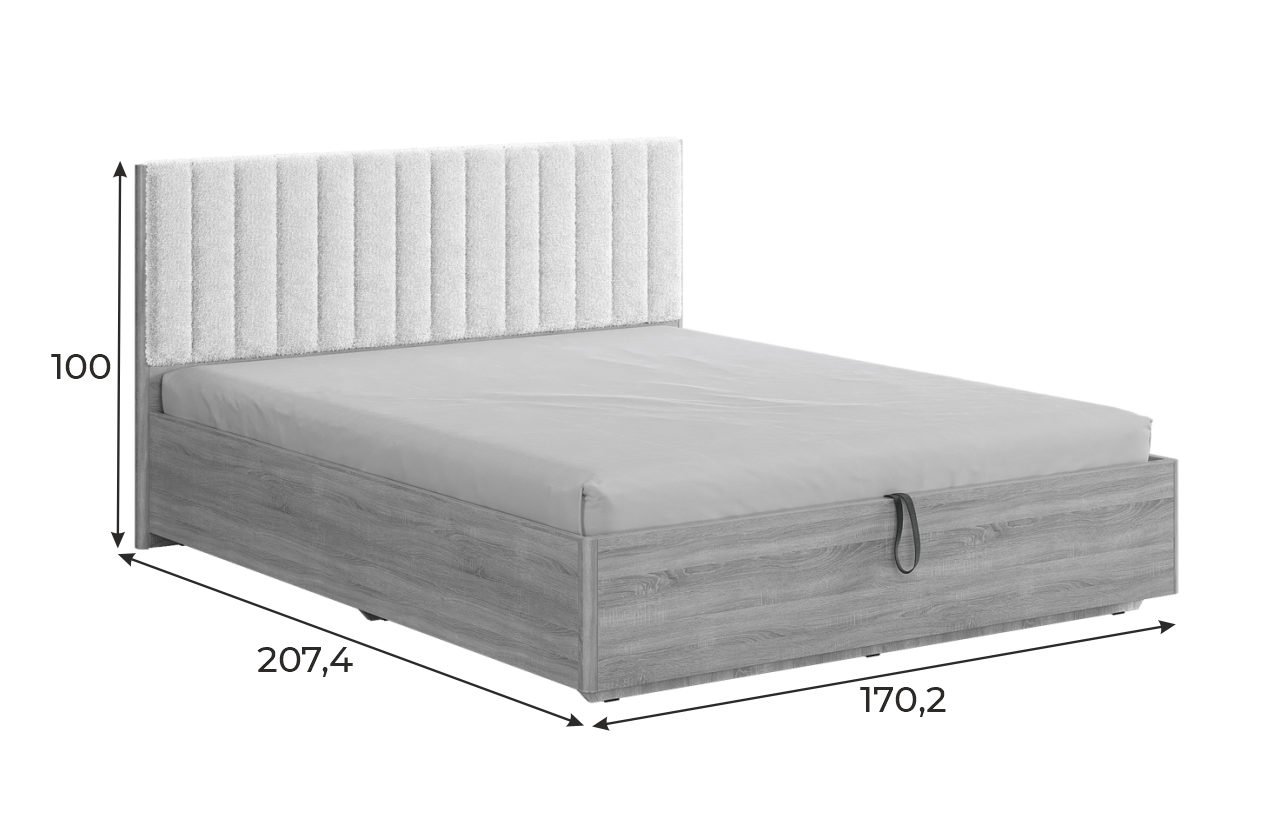 Она не только прекрасно выглядит, но и предлагает дополнительное место для хранения благодаря своему подъемному основанию. Для полноты комфорта учитывайте, что основание для кровати, матрас и настил следует приобрести отдельно.