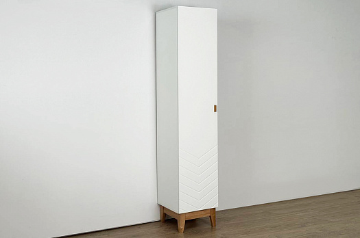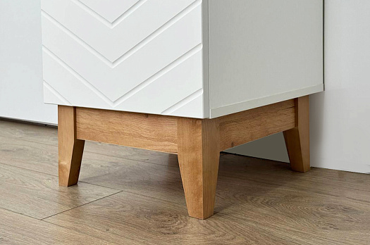 Корпус шкафа выполнен из ЛДСП в цвете белое дерево, что придаёт ему светлый и уютный вид. Фасад – из МДФ с фрезеровкой, покрытый матовой белой плёнкой ПВХ, что подчёркивает натуральность текстуры и создаёт ощущение лаконичности.