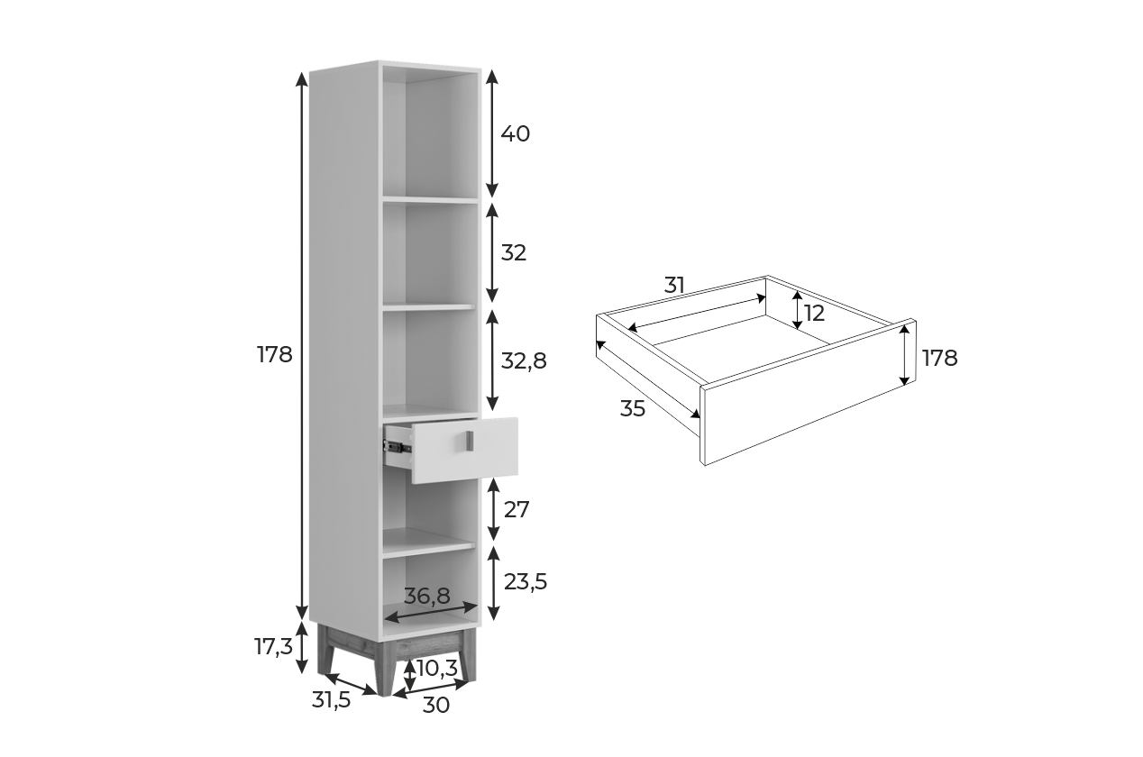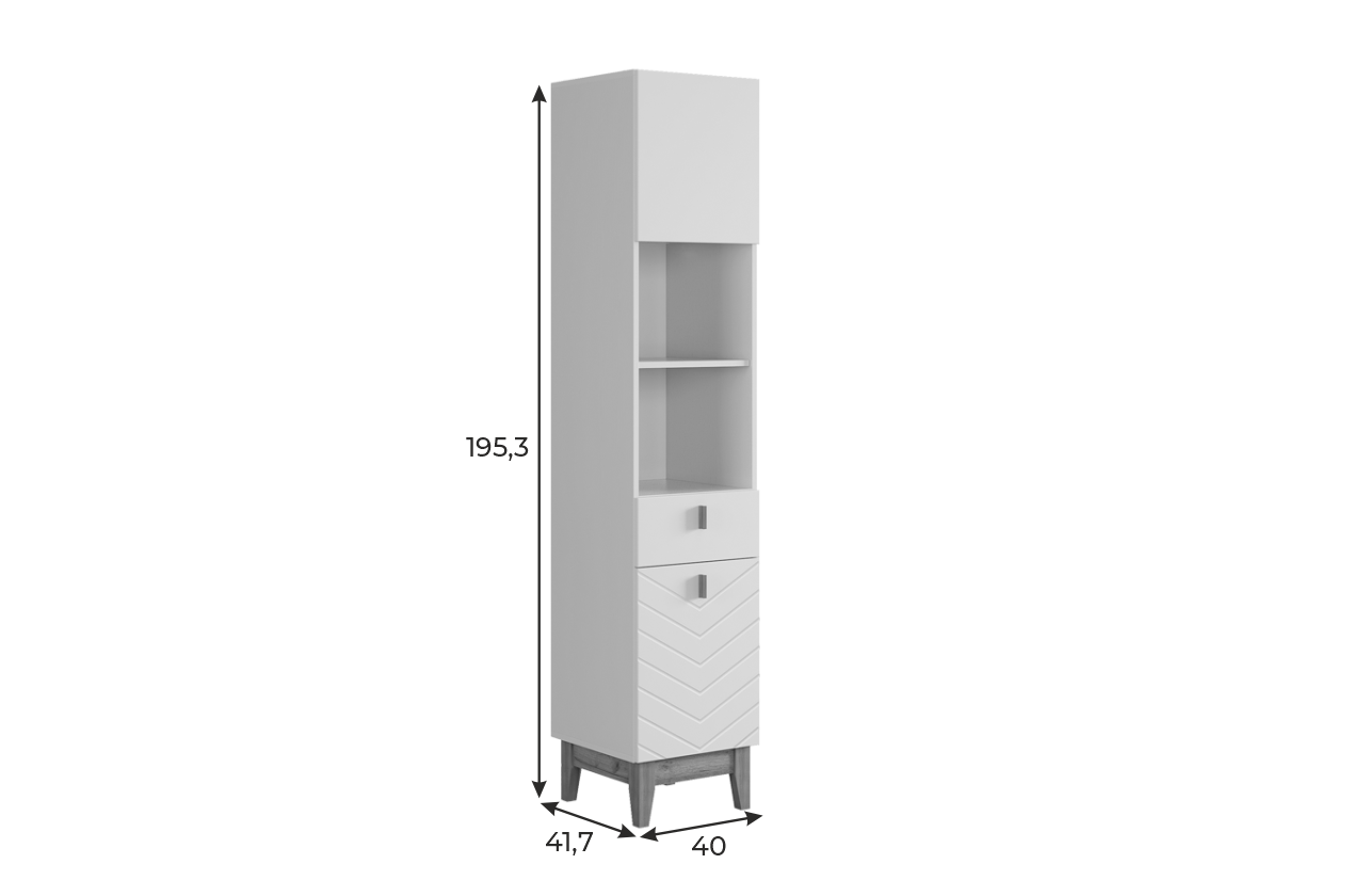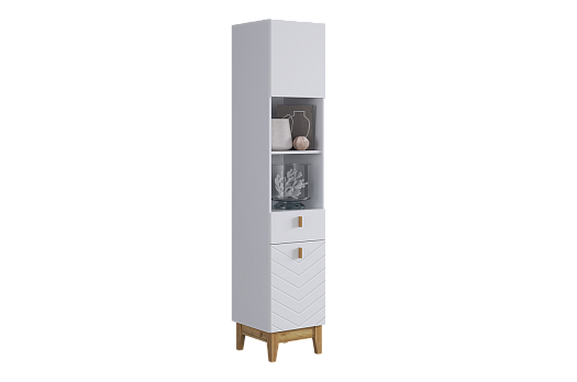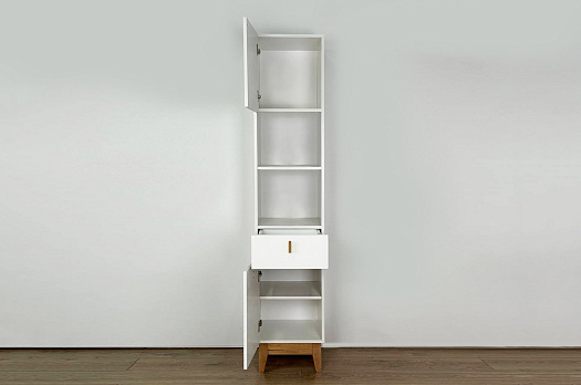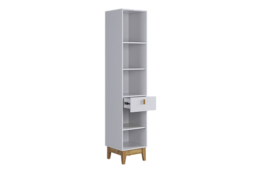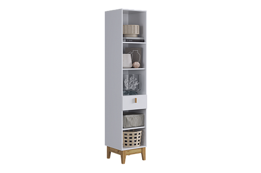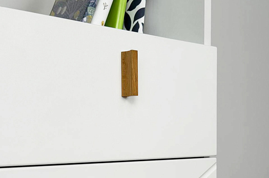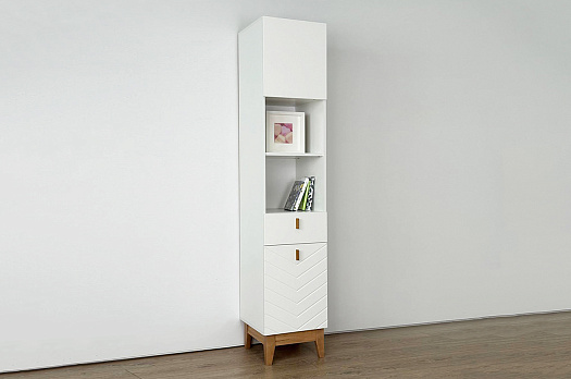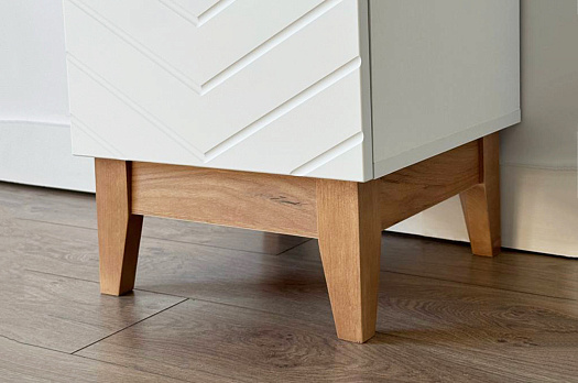 Корпус стеллажа выполнен из ЛДСП в цвете белое дерево, что придаёт ему светлый и уютный вид. Фасады – из МДФ с фрезеровкой, покрытые матовой белой плёнкой ПВХ, что подчёркивает натуральность текстуры и создаёт ощущение лаконичности.